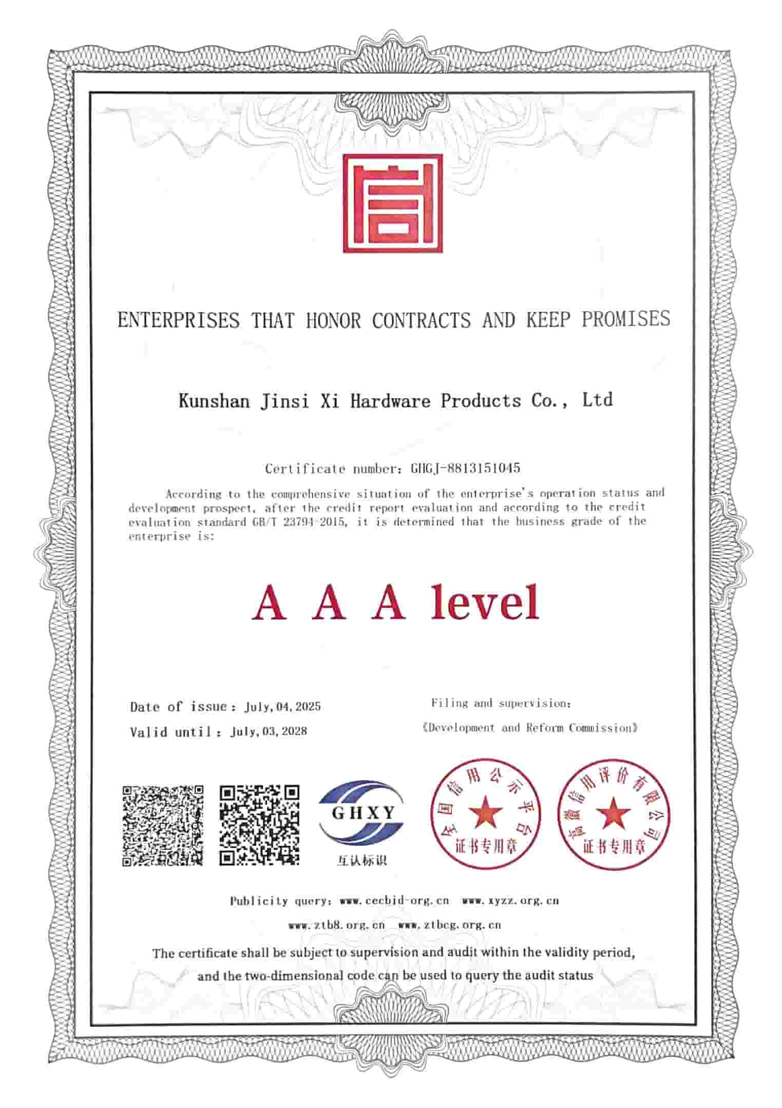 KunshanJINSIXIA Metalware Co., Ltd. hivatalosan elnyerte az "AAA szintű vállalkozások, amelyek tiszteletben tartják a szerződéseket és betartják az ígéreteket" címet. A JINSIXI mindig is ragaszkodott az "egység és együttműködés, szorgalom, a kiválóságra és tökéletességre való törekvés" üzleti filozófiájához, tisztességesen működik, magas színvonalú szolgáltatásokat nyújt az ügyfeleknek, és végső soron a "tökéletes teljesítés" elérését.